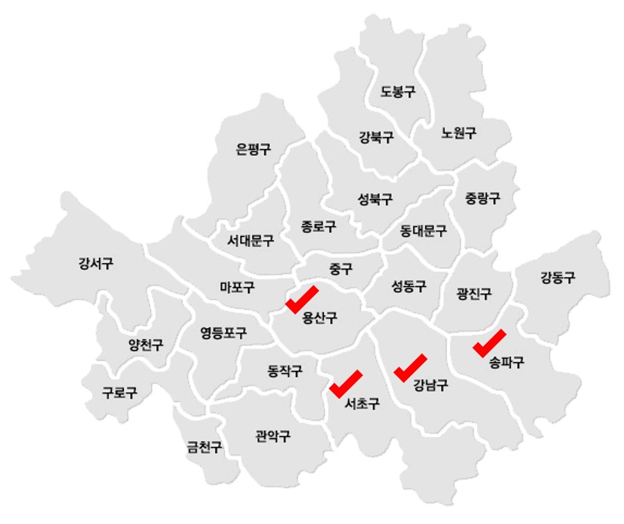 서울시 지도 - 강남3구와 용산구만 규제지역으로 남을 예정이다.