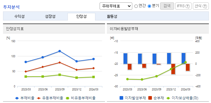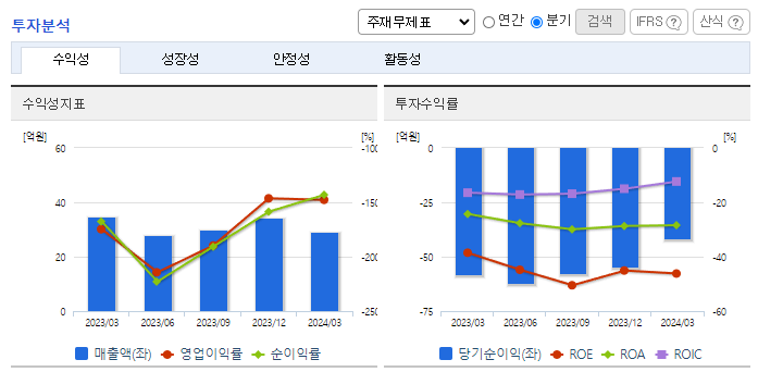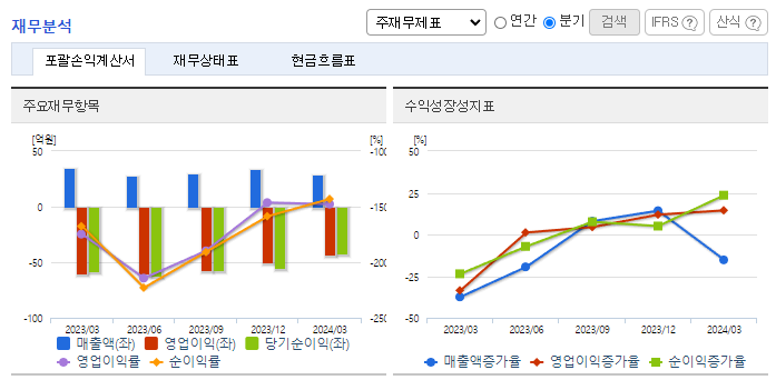 -2024년 3월 전년동기 대비 연결기준 매출액은 15.8% 감소, 영업손실은 28.8% 감소, 당기순손실은 28.7% 감소. 매출원가와 판관비가 19.6%, 26.0% 감소하면서 영업손실에 긍정적인 영향을 줌. 특히 인건비 및 복리후생비가 15.7% 감소하면서 부담을 덜어줌. 동사는 2025년 상반기 품목 허가 승인을 목표로 아토피 피부염 치료제(Furestem-AD Inj.)의 임상 3상을 진행 중에 있음.