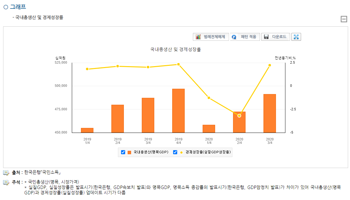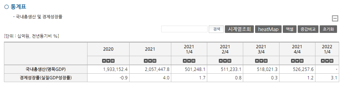 위 그래프는 2020년도 3분기까지만 표시가 되어 있지만, 통계표로는 2021년도 4분기까지 확인 가능하다. 2022년도 1/4분기 경제성장률이 3.1%로 2021년도 합계가 4.0%에 비한다면 높은 수준으로 볼 수 있다.