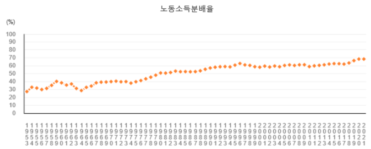 위 부가가치의 구성 요소 중, 피용자보수와 영업 잉여에 대해서 알아보자. 피용자보수는 노동의 대가로 나오는 현금과 현물 등 일체의 보수를 의미하며, 반대로 생산활동을 주관한 생산 주체에게 돌아가는 몫은 영업 잉여라고 말한다. 이 두 가지 지수(피용자보수, 영업 잉여)를 이용하면 노동소득분배율을 알 수 있다. 이 수치는 e-나라지표에서 확인할 수 있으며 점점 상승하고 있다. 즉 피용자보수가 더 커지고 있으며, 노동자의 임금소득이 점점 증가하고 있다는 의미이다.