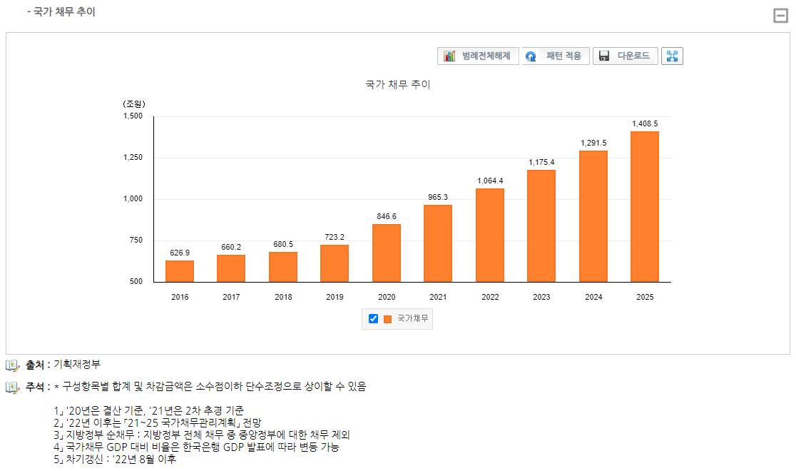 부채라는 것은 결국 빚이고, 채무라고 볼 수 있다. 자본대비 부채의 비율이 커질 수록 불안정해진다는 의미인데, 국가의 채무는 계속 커지고 있다. 국가의 자본이 있는지는 모르겠지만, 국가는 채권을 지속적으로 발행하여 채무는 지속적으로 커지고 있다.