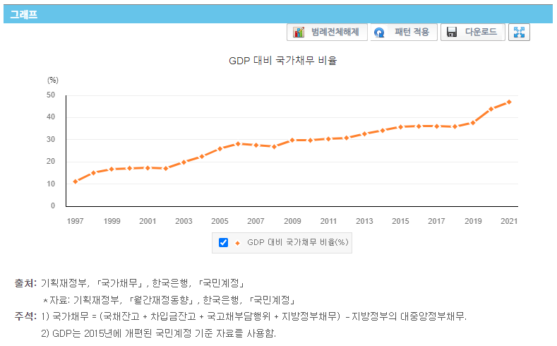 추가로 확인할 수 있는 지표가 하나가 더 있는데 국가채무비율(GDP대비) 이다. 2015년 이후로는 이 비율을 유지하는 추세였다가 2020년도에 급 상승하여 40%를 넘었다. 아마도 코로나 사태로 인한 지원금을 위하여 국가 채무가 급증한 것으로 추정이 된다. 국가 채무 자체는 줄어들지 않을 것으로 추정이 되지만, 그만큼 GDP를 높일 수 있다면 하기 추이는 줄어들 것으로 추정이 된다. 이것이 어느정도 수준까지가 괜찮을지는 아직 알 수가 없다.