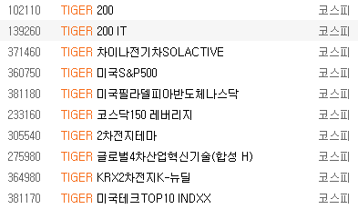 이 외에도 다양한 종목이 존재한다. 아래 TIGER로만 검색해도 다양한 ETF가 나오는 것을 알 수 있다. 이 외에도 많은 양의 ETF가 있으니 확인해보면 좋을 것 같다.