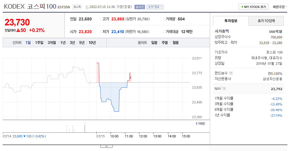 2) 코스피 100 -> 이는 코스피 100 지수를 추종한다는 의미이다. 코스피 100이란, 코스피 지수를 구성하는 여러 종목 중 시가 총액을 기준으로 상위 100 종목을 의미한다.
