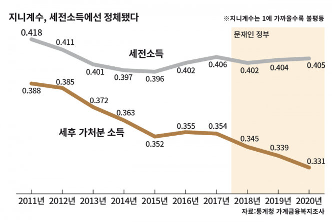 지니계수는 대표적 소득 불평등 지수이다. 소득분배율은 커졌지만, 소득 불평등 지수인 지니계수는 큰 변화가 나타나지 않았다.