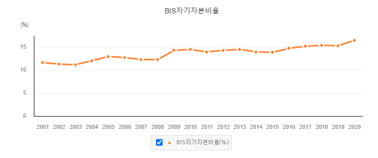 신용경색은 은행이 부실해지면 발생할 수 있다. 즉, 은행이 부실해지면 자금이 부족해지고, 자금 흐름을 받지 못하는 기업들이 도산하게 된다. 신용경색이 발생하기 전에 BIS 자기자본비율을 보면 은행이 부실한지, 부실하지 않은지 알 수 있다. BIS 자기자본비율은 (은행부문 자기자본 / 위험가중자산) 이다. 추이를 살펴보면 10~15% 수준에서 상승하고 있으며, 2017년도 이후로 15%를 넘겼다.