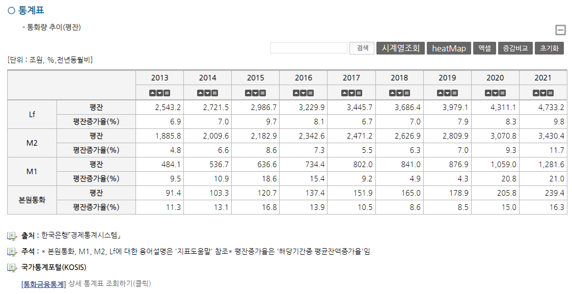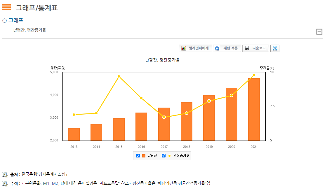 e-나라지표 사이트에서 통화량에 대해서 확인할 수 있다. 아래 그래프는 Lf 평잔을 나타낸 차트이다. 확인해보면 매년 Lf 평잔이 증가하는 것을 볼 수 있고, 심지어 평잔 증가율도 2017년 이후 점점 증가하고 있는 것을 알 수 있다.