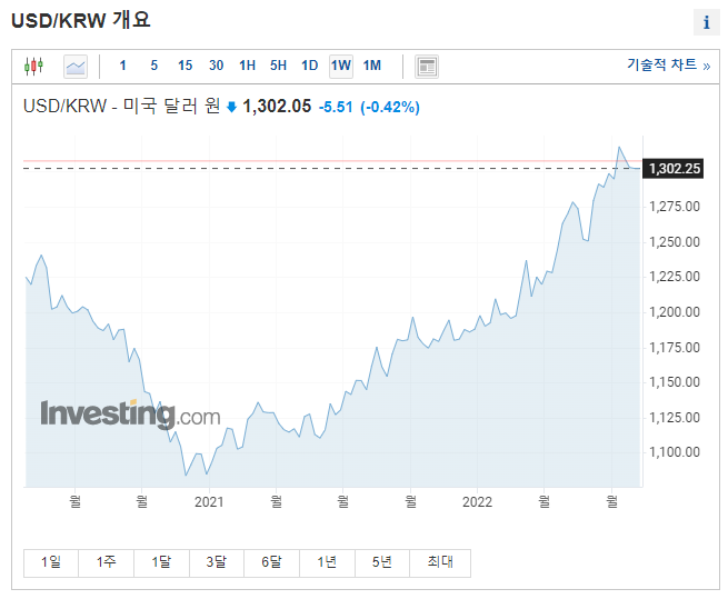 현재 원/달러 차트를 보면 2021년 이후 어마어마하게 상승을 한 것을 볼 수 있다. 2021년도에 달러를 구입했으면 싸게 사서 비싸게 팔 수 있는 기회였을 것이다.