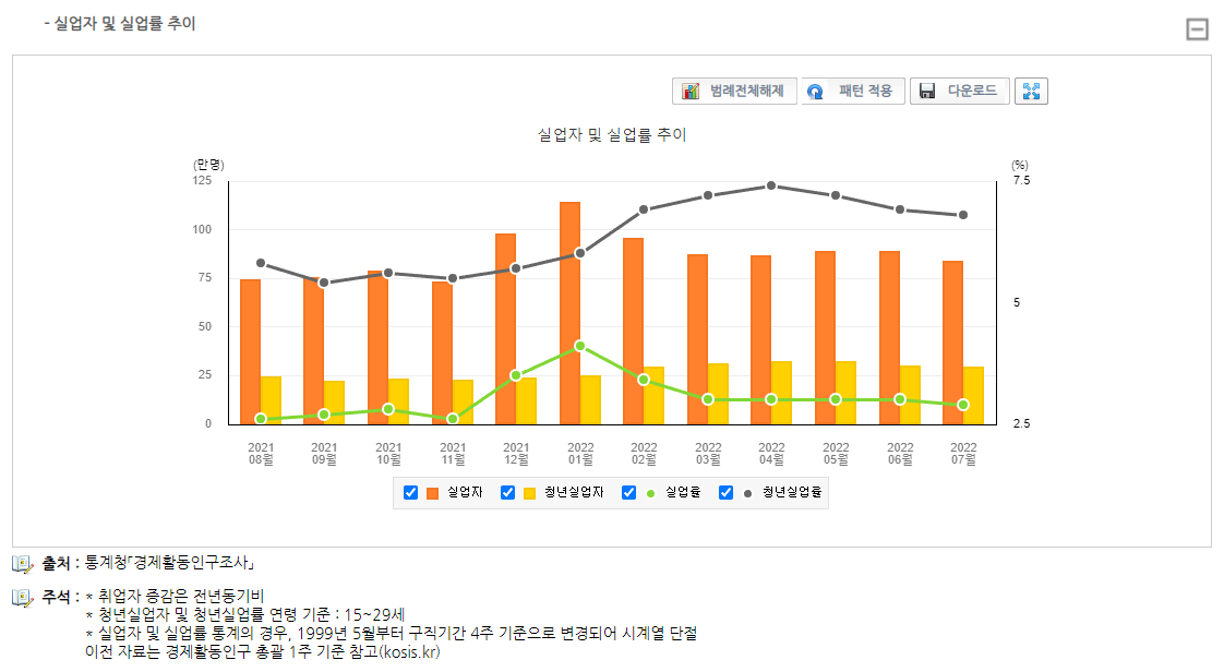 이러한 실업 관련 수치는 경제 수준을 판단할 수 있는 주요 지표이기 때문에 잘 모니터링 해야할 것이다.