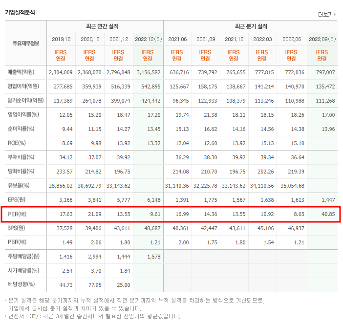아래로 내려가면 최근 연간실적, 최근 분기실적도 확인할 수 있는데, PER의 변화에 대해 살펴볼 수 있다. 단순하게 수치 하나만 보고 기업기 고평가인지, 저평가인지 판단하기는 어렵지만, PER을 기준지표로 생각하고 해당 지표의 변화를 살펴보면 기업을 평가하는데 도움이 될 것이다.