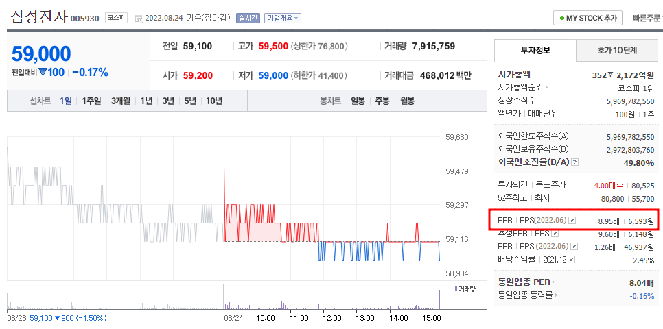 우측 투자정보에서 PER을 확인할 수 있으며, 다른 정보도 확인할 수 있다.