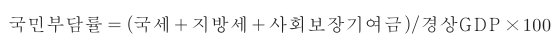 한편, 국민부담률이란 개념도 있는데 이는 국가가 가입을 의무화하거나 재정에서 지급을 보장하는 각종 공적 사회보험에 대한 보험료 등을 조세수입에 더하여 경상GDP대비 비율을 산출한 것이다. 사회보장기여금은 4대 공적연금인 국민연금, 공무원연금, 사학연금, 군인연금과 고용보험, 산업재해보상보험, 건강보험, 노인장기요양보험 등이다.