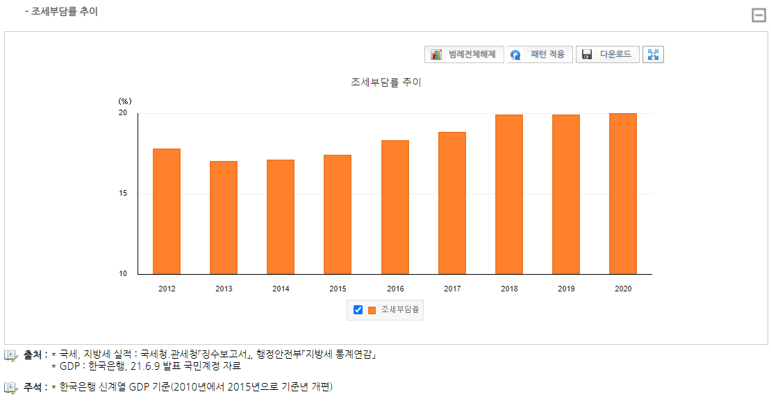 e-나라지표 사이트에서 확인한 조세부담률은 아래와 같다. 차트상으로는 2020년도까지 나와있고, 2013년 이후로 조금씩 올라 20%까지 상승하였다.