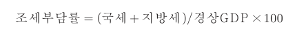 조세부담률은 국민계정에서 조세수입이 국민총소득(GNI)에서 차지하는 비중으로 정의된다. 이는 국민 전체의 조세부담 정도를 나타내 주는 지표로 조세의 누진 정도, 국가의 조세징수능력 등에 따라 결정된다. 반면, 재정통계의 조세부담률은 국가 및 지방자치단체가 거둬들인 국세 및 지방세 수입이 경상금액기준 국내총생산에서 차지하는 비율로 파악된다. 조세부담률이 높다는 것은 국민들이 벌어들인 소득 중에서 세금으로 납부하는 비중이 높다는 것이다.