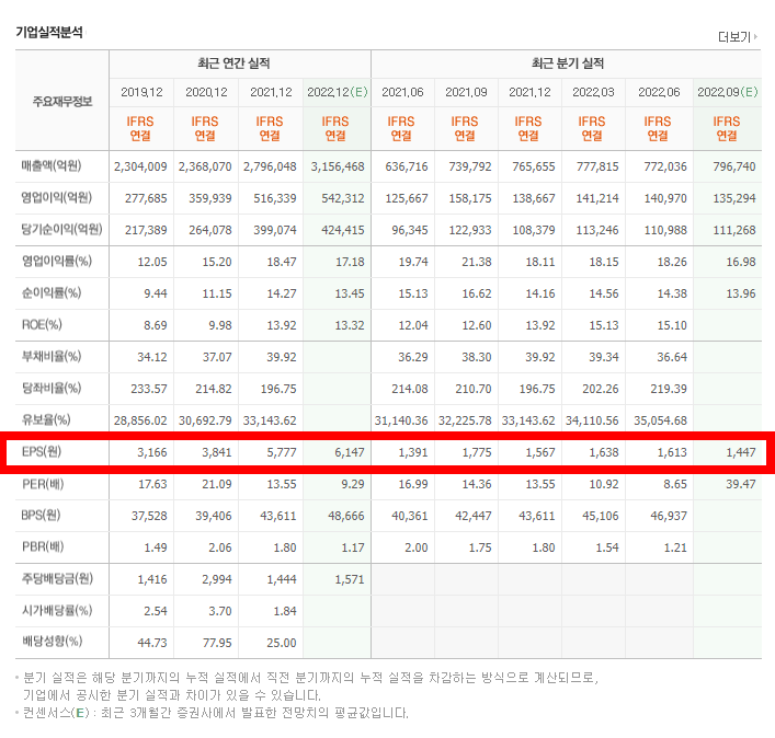 오른쪽 투자 정보를 보면 EPS 를 확인할 수 있으며 6,593원으로 확인할 수 있다. 이는 2021.06~2022.06까지 연간 이익을 기준으로 주식수로 나눈 값이 된다.