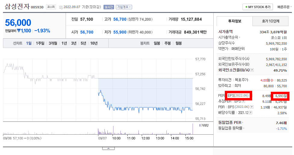 네이버 금융 사이트에서 삼성전자를 검색해보면 다양한 지표를 볼 수 있으며 그 중 EPS 를 확인해보았다.