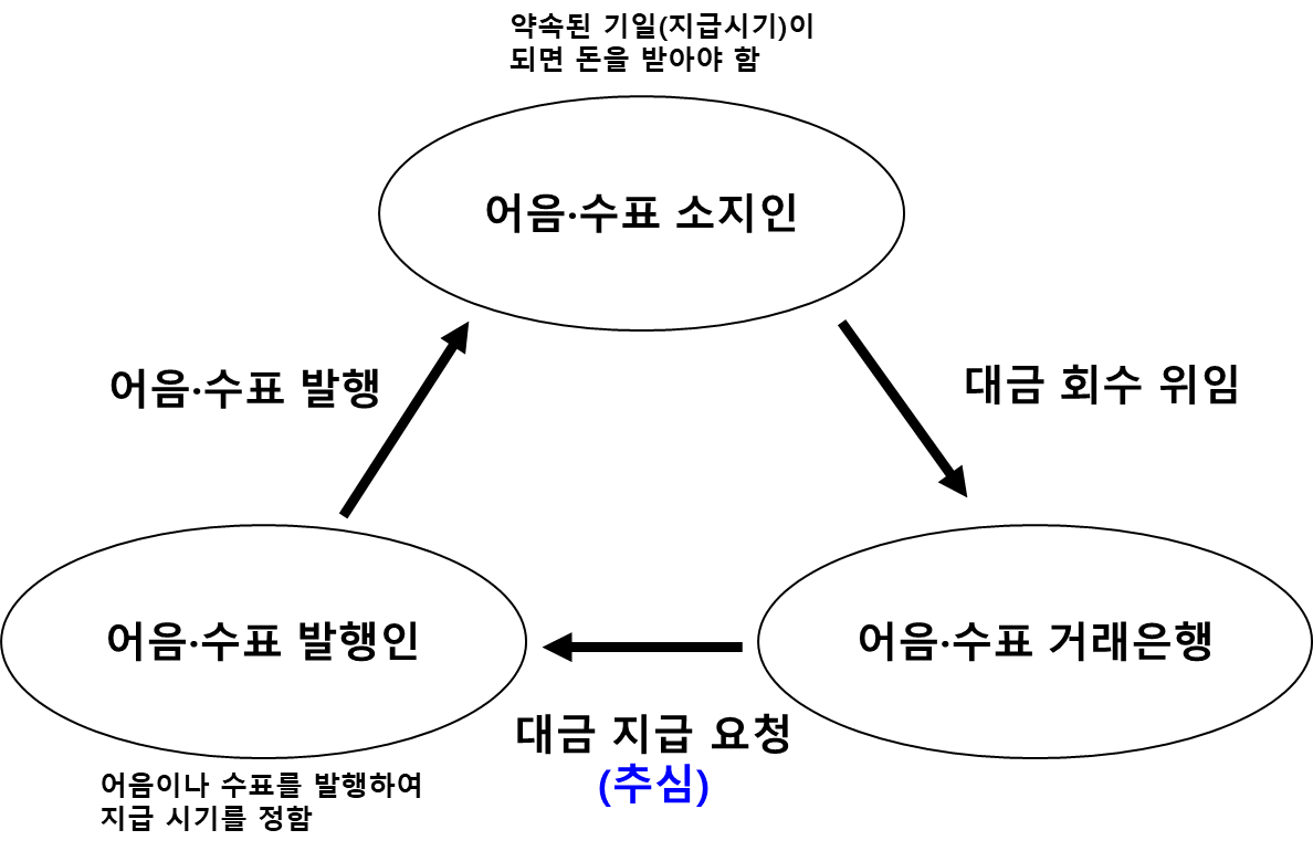 일반적으로 어음・수표소지인이 거래은행에 어음・수표대금 회수를 위임하고 동 위임을 받은 거래은행은 어음・수표 발행점포 앞으로 동 대금의 지급을 요청하는 일련의 절차를 말한다. 이를 쉽게 설명하면 빚을 독촉하는 것과 유사하다.