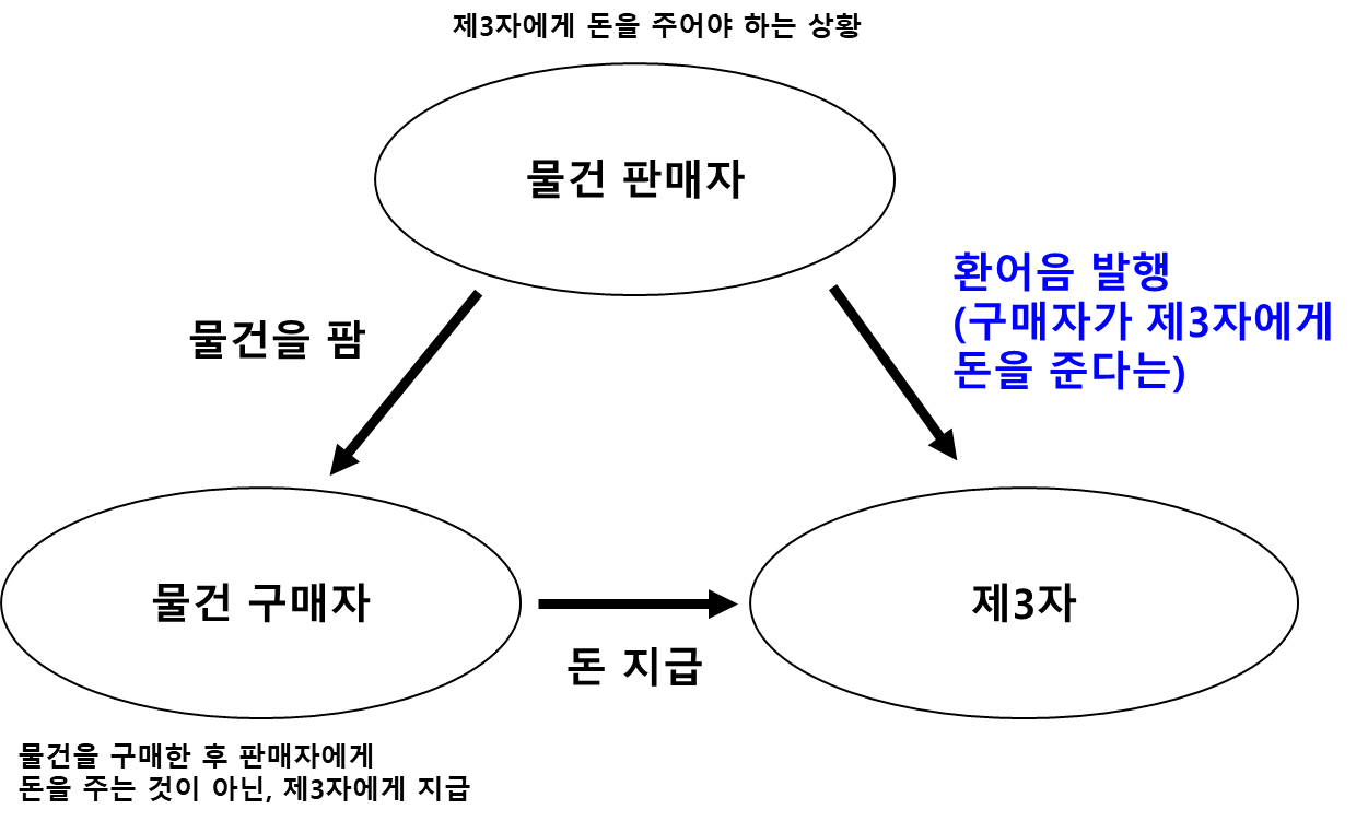 환어음이란 아래 그림과 같은 상황이다. 제 3자에게 빚이 있는 판매자가, 물건을 구매자에게 판매한 후 대금은 제 3자에게 지급하도록 하는 것이다. 이러한 상황은 물리적 거리가 제한되는 상황일 때 사용된다.
