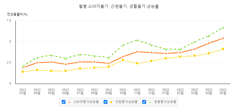 통계청에서 재공하는 물가지수에는 크게 소비자물가, 근원물가, 생활물가가 있다. 지수는 전년 동월과 비교해서 상승인지, 하락 중인지 알 수 있다. 글을 작성하는 시점 2022년 7월에서 5월까지 지수는 물가상승이 보이고 있다. 따라서 위에서 말한 디플레이션인 상황은 아니다.