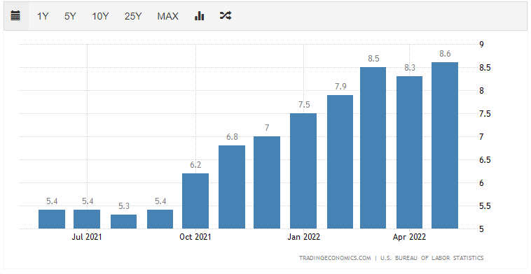 현시점으로 눈여겨보아야 할 지수는 미국의 물가 상승률이다. FOMC에서 금리를 결정하는데, 물가를 잡지 못하면 금리를 지속 올리겠다는 의지를 보이고 있다. 3월부터 8%대를 보이고 있어 금리를 올려 물가를 잡을 자세를 취하고 있다. 금리가 높아지면 대출에 따른 이자 부담이 높아진다. 따라서 물가 상승률과 FOMC에서 금리를 어떻게 조정하는지 잘 보아야 할 것이다.