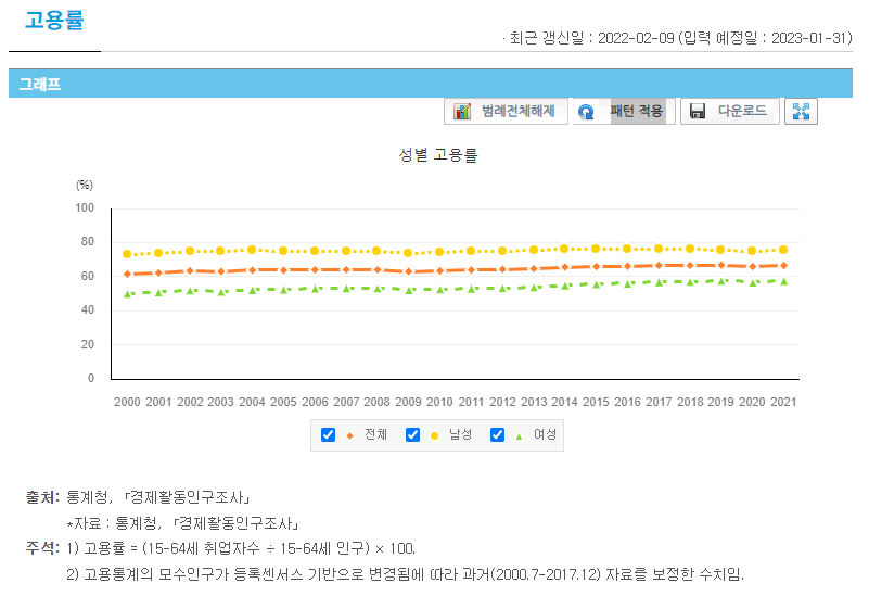22년 6월 18일 기준 고용률 확인 시 22년 2월 9일이 최근 갱신일임을 확인할 수 있으며 22년 고용률은 2023년 1월 31일 입력 예정이라는 것도 확인할 수 있었다. 확인해본 고용률은 아래와 같다. (성별로 분류가 된다.)