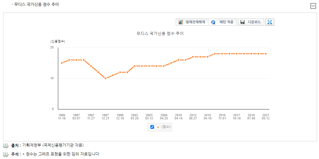 1998년 IMF 시점에서 신용 점수가 낮아진 것을 확인할 수 있으며 이후 꾸준하게 상승되었다.