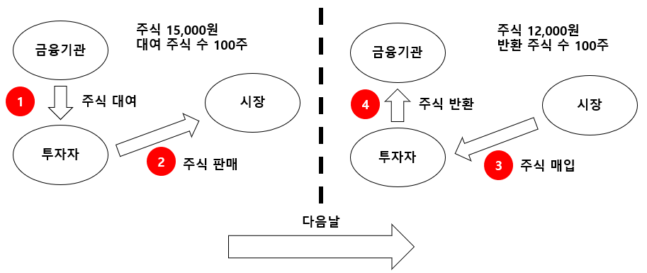 공매도(short selling)란 없는 것을 판다는 의미로 쓰이는데 주식시장에서 공매도란 투자자가 주식을 보유하지 않은 상태에서 주가 하락을 예상하고 금융기관으로부터 주식을 빌려 먼저 매도한 후, 주가가 하락하면 시장에서 주식을 매입하여 되갚은 후 차익을 얻는 투자를 말한다. 예를 들어 투자자가 A주식을 빌려 주당 15,000원에 팔고 며칠 후 그 주식이 12,000원으로 하락하였다면 12,000원에 주식을 매입하여 빌린 A주식을 되갚으 면 주당 3,000원의 수익을 얻는다. 주가가 하락할 경우에는 수익을 얻지만, 예상과 달리 주가가 상승할 경우에는 큰 손실을 볼 수 있다는 점에서 공매도 투자는 매우 신중히 접근해야 한다. 특히 공매도는 주식시장이 약세장이 되었을 때 이득을 볼 수 있지만 전체 거래가 이런 분위기에 편승해 공매도에 쏠릴 경우 주식시장이 한순간에 폭락하는 등 주식시장의 변동성을 확대시키는 측면이 있기 때문에 각국에서는 공매도에 대해 많은 규제를 하고 있다. 우리나라도 2008년 9월 금융위기 직후 주식시장 안정을 위해 모든 종류의 공매도를 금지시킨 바 있다.