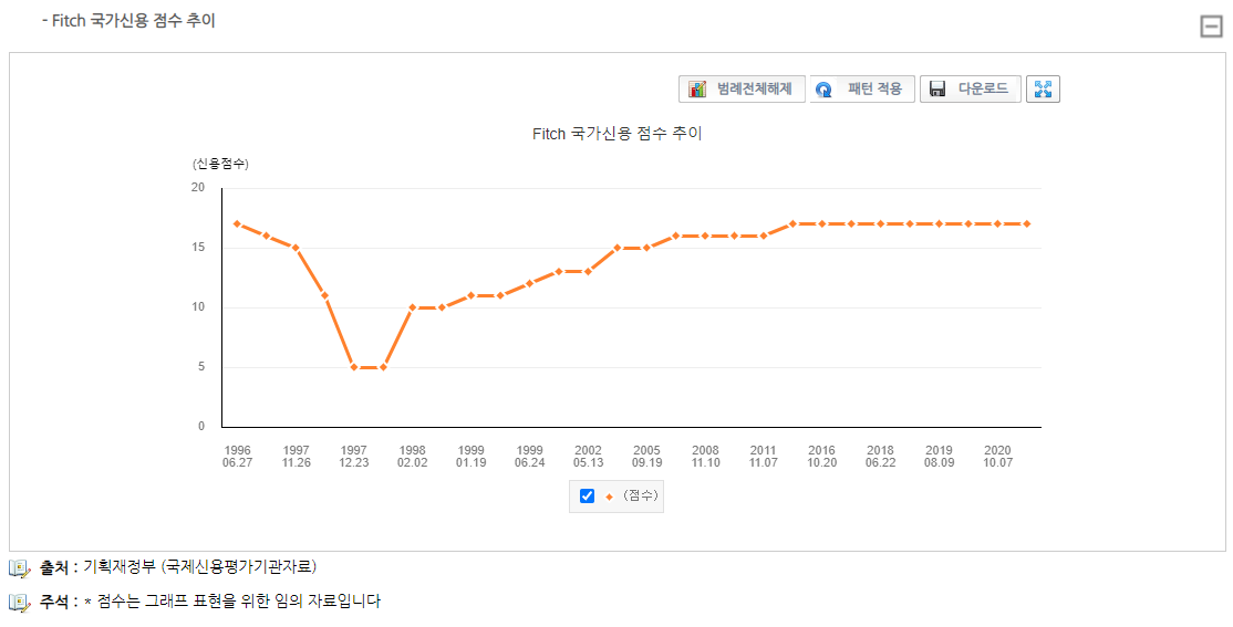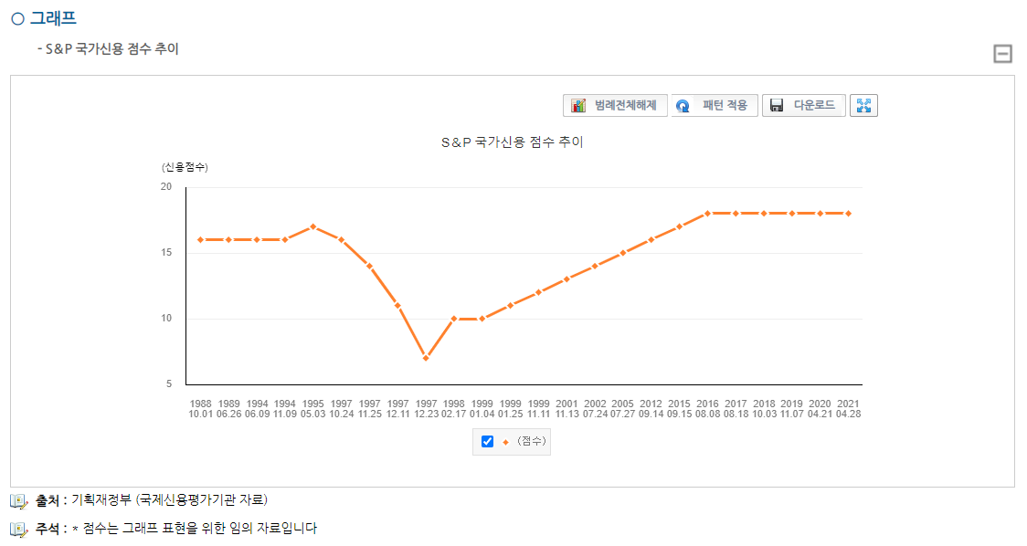 한국의 국가신용등급은 아래 e-나라지표에서 확인이 가능하다.