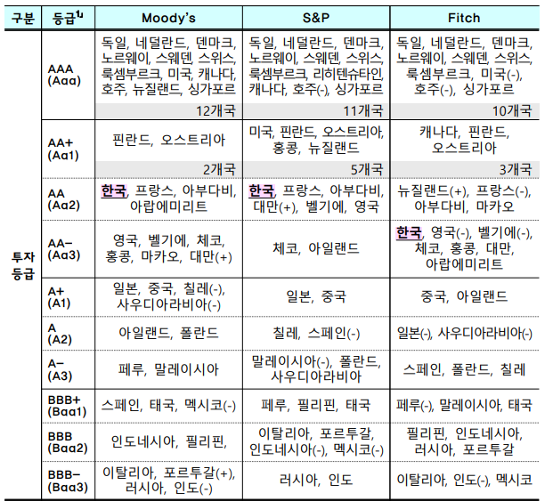 보도자료 확인 시 한국은 상위 등급을 보유하고 있으며, 아시아 국가에서는 싱가포르 다음으로 높은 등급을 보유하고 있다.