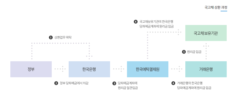국채의 상황이란 국채의 원리금이 보유자에게 지급되고 국채가 소멸되는 일련의 과정이다. 즉, 빚을 갚는 과정이다. 원칙적으로 만기일에 이루어지며, 한국은행이 원리금 지급일에 한국예탁결제원의 한국은행 당좌예금계좌로 원리금 해당금액을 일괄 입금하면 한국예탁결제원은 국고채 보유기관 등의 한국은행 당좌예금계좌에 원리금을 입금함으로써 완료된다.