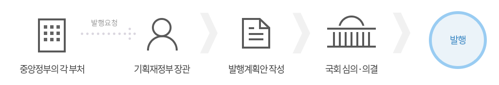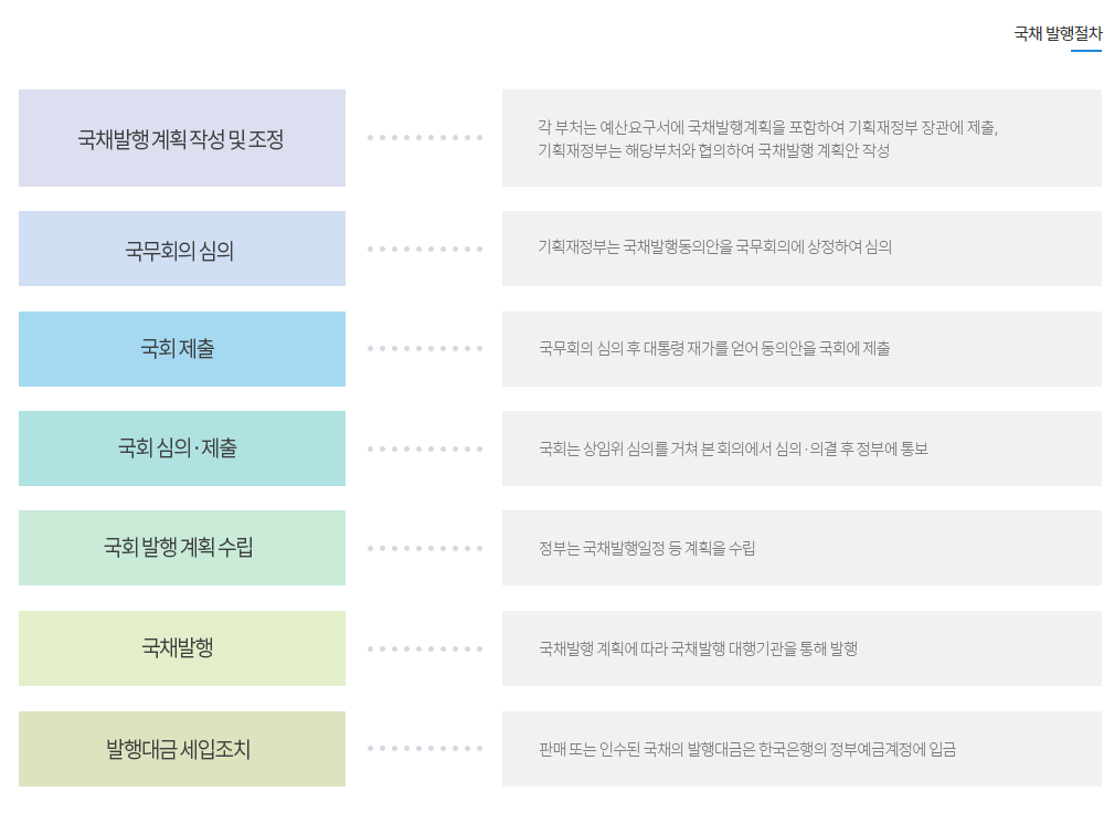 국채 발행 절차는 아래와 같은 순서를 따른다. 국무회의 심의를 거쳐 의결된 후 발행이 된다.