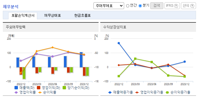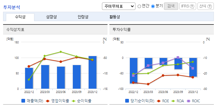 -2023년 12월 전년동기 대비 연결기준 매출액은 185.5% 증가, 영업손실은 9% 감소, 당기순손실은 36.8% 감소. 동사는 2023년 '마이노멀 플랜트 콜라겐 펩타이드', '마이니멀 플랜트 락토바실러스 균주' 등 신제품을 출시하여 누적 매출액 22,551백만 원 시현함. 2023년 12월 미국 FDA GMP 인증을 획득하였으며, 규모가 큰 미국 시장과 성장성이 돋보이는 유럽 시장 진출에 본격적인 준비를 하고 있음.