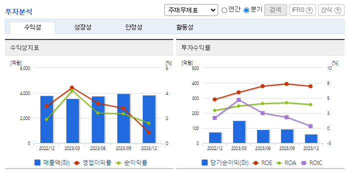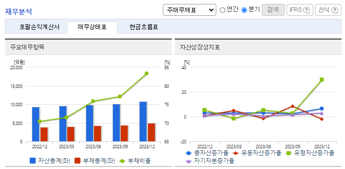 -2023년 12월 전년동기 대비 연결기준 매출액은 5.8% 증가, 영업이익은 10% 증가, 당기순이익은 52.9% 증가. 약국영업부문 청심원 등의 실적상승과 병원영업부문 백신류 부스트릭스, 싱그릭스주, 로타릭스 등의 판매호조, F&B부문에서는 삼다수, 비타 500, 옥수수수염차, 헛개차 등 주력제품의 안정적인 매출 실적 개선 이어짐. 차입금 잔액이 전년대비 961억 원 증가. 대부분 제1금융권 차입금으로 상환 압박 크지 않음.