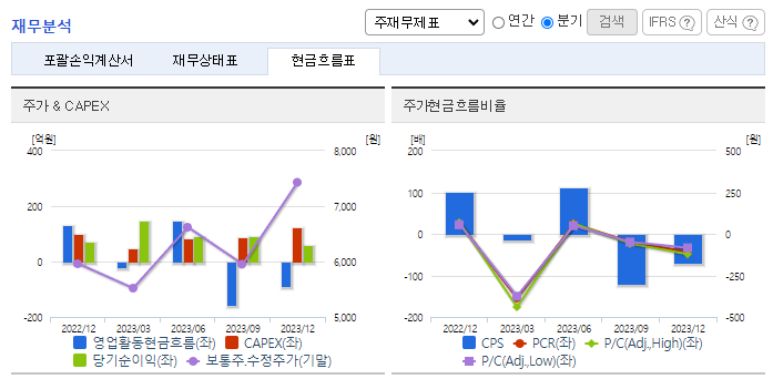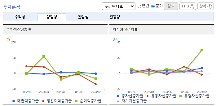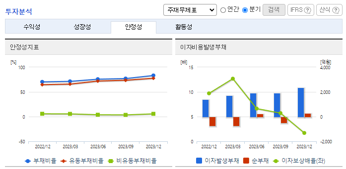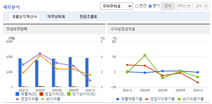 -2023년 12월 전년동기 대비 연결기준 매출액은 5.8% 증가, 영업이익은 10% 증가, 당기순이익은 52.9% 증가. 약국영업부문 청심원 등의 실적상승과 병원영업부문 백신류 부스트릭스, 싱그릭스주, 로타릭스 등의 판매호조, F&B부문에서는 삼다수, 비타 500, 옥수수수염차, 헛개차 등 주력제품의 안정적인 매출 실적 개선 이어짐. 차입금 잔액이 전년대비 961억 원 증가. 대부분 제1금융권 차입금으로 상환 압박 크지 않음.