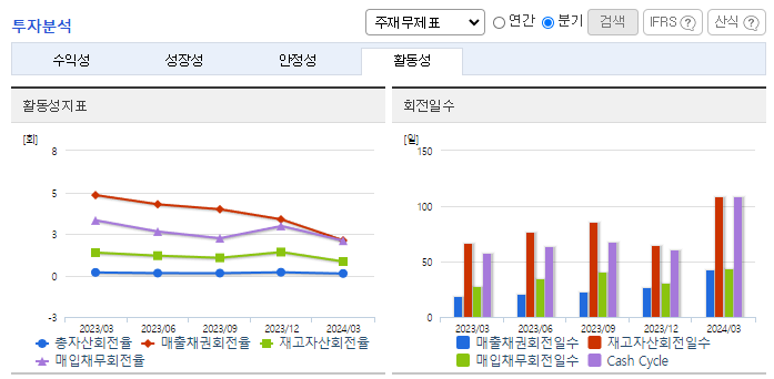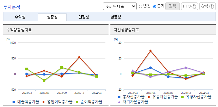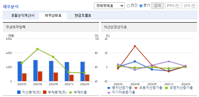 -2024년 3월 전년동기 대비 연결기준 매출액은 37.1% 감소, 영업이익은 14.7% 감소, 당기순이익은 77.6% 감소. 국내외 전반적인 내수경기 위축으로 크레인 및 고소작업차의 시장규모가 감소하고 해외영업의 경우 주요 수출국인 러시아의 수출규제로 인하여 매출감소가 불가피. 철스크랩 및 파지등의 가격인상으로 굴절식크레인의 수요가 증가할 것으로 기대되고 있음.