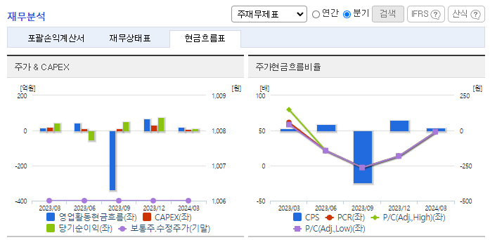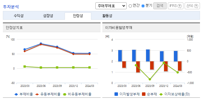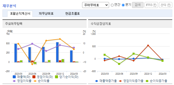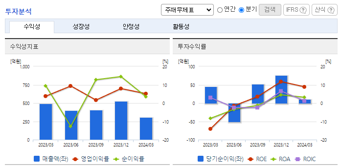 -2024년 3월 전년동기 대비 연결기준 매출액은 37.1% 감소, 영업이익은 14.7% 감소, 당기순이익은 77.6% 감소. 국내외 전반적인 내수경기 위축으로 크레인 및 고소작업차의 시장규모가 감소하고 해외영업의 경우 주요 수출국인 러시아의 수출규제로 인하여 매출감소가 불가피. 철스크랩 및 파지등의 가격인상으로 굴절식크레인의 수요가 증가할 것으로 기대되고 있음.