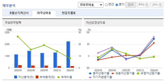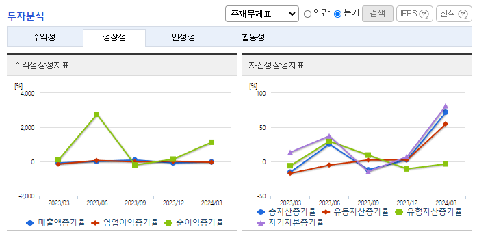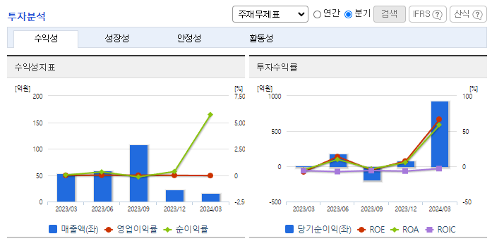 -2024년 3월 전년동기 대비 연결기준 매출액은 69.7% 감소, 영업손실은 41% 감소, 당기순이익은 14910.7% 증가. 동사는 이번 당기순이익이 전년동기 대비 150배 증가한 수준으로, 지난해 연간 총순이익과 비교해도 12배 이상 증가하였음. TRS 파생상품평가이익 등이 반영된 영향임. 원자재값 부담을 덜어내고 대외 변수에 의존하는 소재사업 한계를 극복하기 위해 금융이익 등 수익성을 강화했음.