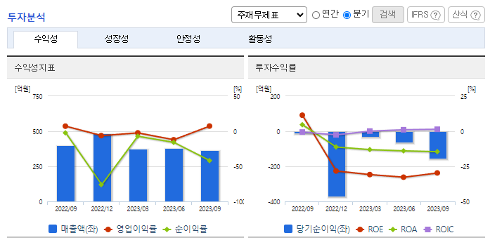 -2023년 9월 전년동기 대비 연결기준 매출액은 27.4% 감소, 영업이익 적자전환, 당기순이익 적자전환. 지난해에 이어 내수 및 수출 동반 부진한 모습을 보이고 있으며, 원가율 또한 증가한 영향으로 수익성 크게 하락하며 적자 전환된 모습. 자동차 내장재 및 친환경 발포제 개발과 추진 중인 원통형 이차전지 사업과 수소연료전지 사업의 성공여부가 동사의 향후 성장 가능성의 척도가 될 것으로 판단됨.