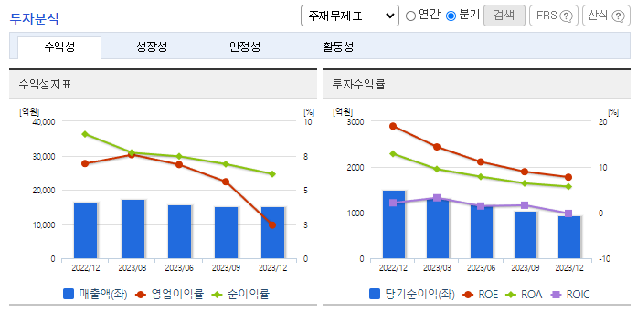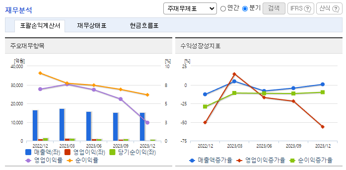 -2023년 9월 전년동기 대비 연결기준 매출액은 24.1% 감소, 영업이익은 68.8% 감소, 당기순이익은 59.4% 감소. 세계경제 침체 속 원재료 가격하락 영향으로 판매단가 하락에 기인하여 2023년 3분기 합성고무 부문 누계 매출액 전년 동기대비 22% 감소함. 합성수지 부문은 중국 경제 리스크와 성장 둔화 우려, 글로벌 긴축 기조 지속 등 경기부진 영향으로 저조한 시황을 보임.