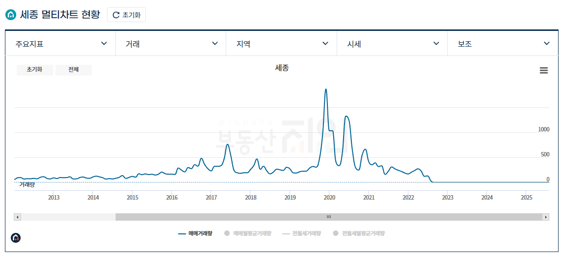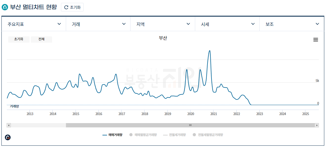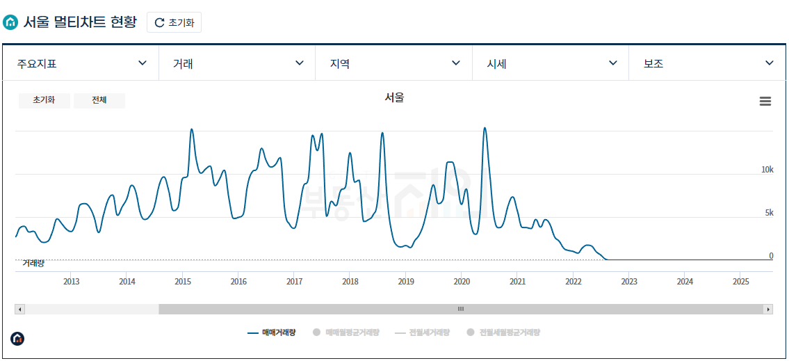 서울의 매매 거래량을 보면 2021년도 말부터 차트가 감소하면서 2022년에는 거래량이 확실하게 감소하였다.