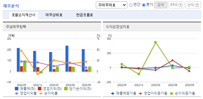 -2023년 9월 전년동기 대비 연결기준 매출액은 0.7% 증가, 영업이익은 37.3% 감소, 당기순이익은 36.6% 감소. 매출액이 소폭 증가했으나, 각종 제반 비용의 상승으로 인해 영업이익은 30% 넘게 줄어듦. 대만 시장에 상장된 파트너와 함께 대만 디스플레이 시장을 공략 중이고 유럽지역은 간접 판매 수단으로 당사가 생산하는 제품과 겹치지 않는 Metal target 업체와의 협력을 통해 비즈니스 확대를 추진 중임.