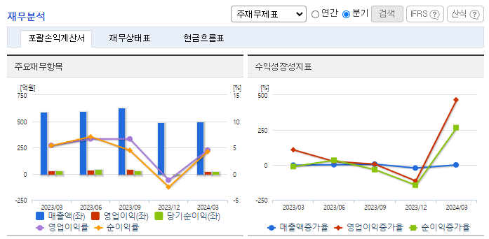 -2024년 3월 전년동기 대비 연결기준 매출액은 16% 감소, 영업이익은 29.6% 감소, 당기순이익은 21.5% 감소. 금형의 경우 입찰에 의해 가격이 결정되나 금형의 제작과정에서 제품도면의 변경에 따라 금형수정이 빈번히 발생하여 초기결정된 가격이 변경되는 경우가 많음. 금형매출액의 약 61%는 수출에 해당되는데 수주시점의 환율과 판매시점의 환율 변동에 의해 원화가격이 변경되는 경우가 발생함.