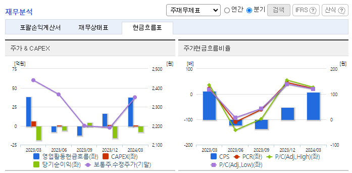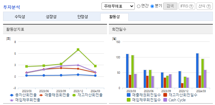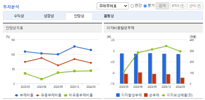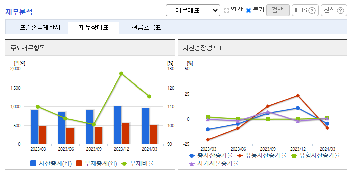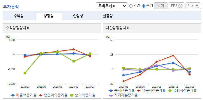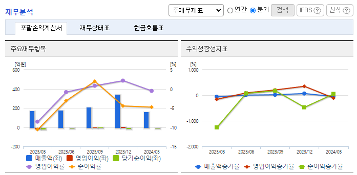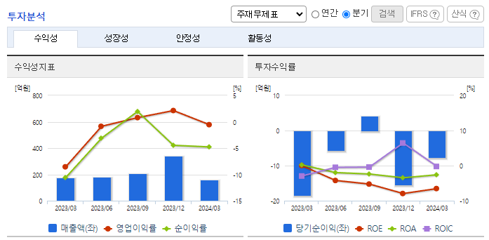 -2024년 3월 전년동기 대비 연결기준 매출액은 8.1% 감소, 영업손실은 94.1% 감소, 당기순손실은 41.2% 감소. 동사의 매출구성 중 솔루션용역 사업 부문이 22.44% 증가했지만 서버, 스토리지 장비류 및 솔루션 상품 사업 부문이 73.56% 감소하면서 전체 외형 성장에 악영향을 줌. 매출원가와 판관비가 19.1%, 2.3% 감소하면서 영업손실에 부담을 덜어줌.