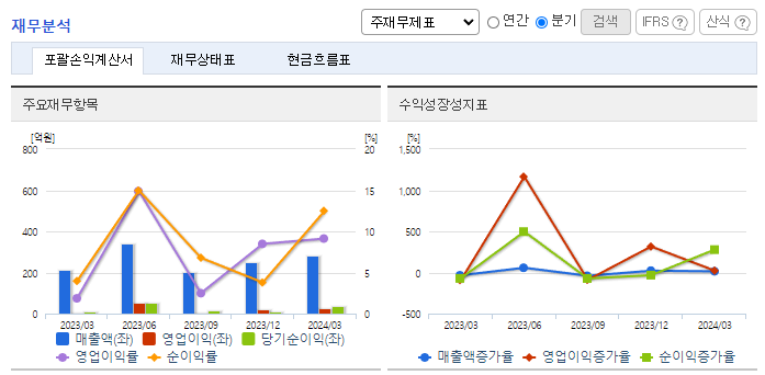 -2024년 3월 전년동기 대비 연결기준 매출액은 31.8% 증가, 영업이익은 547.6% 증가, 당기순이익은 315.8% 증가. 에스케이 하이닉스와 67억 규모, 네오셈 테크놀로지와 71억 원 규모의 반도체검사장비 개발 및 영업 계약을 체결했고 이를 통해 매출 성장. 삼성전자가 컴퓨트익스프레스링크(CXL) D램 개발에 집중하는 만큼, CXL 주력인 네오셈의 매출 증대가 기대됨.