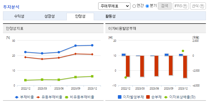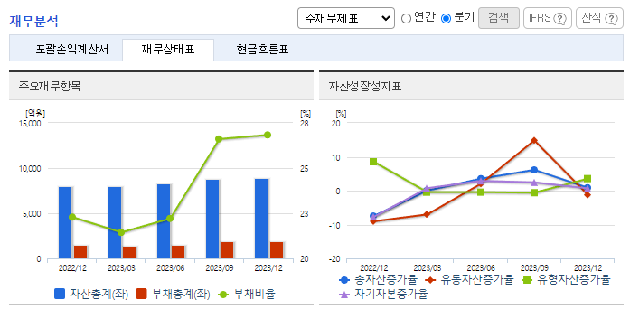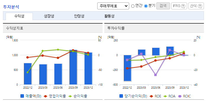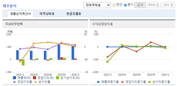 -2023년 12월 전년동기 대비 연결기준 매출액은 23% 증가, 영업이익은 148.1% 증가, 당기순이익 흑자전환함. 전년 대비 매출과 이익이 동반 성장한 주요 요인은 주요 자회사인 네오위즈의 기대 신작 'P의 거짓'과 '브라운더스트2'의 성과의 영향이 컸음. 동사의 주요 자회사인 네오위즈파트너스의 투자자산에 대한 평가손실 기저효과도 당기순이익 증가에 기여함,
