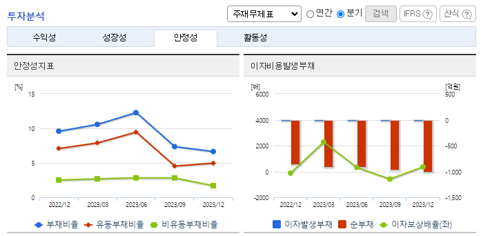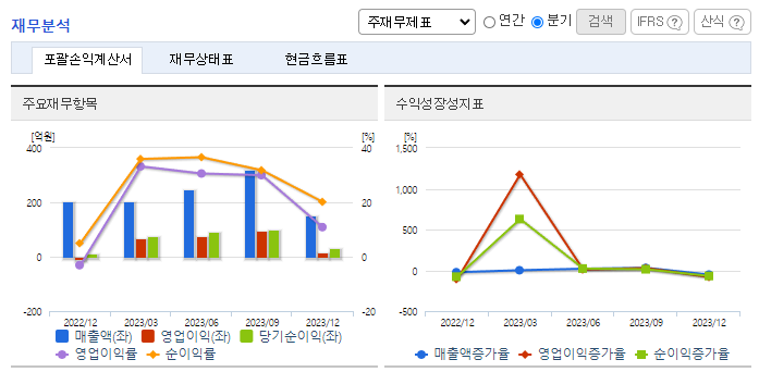 -2023년 12월 전년동기 대비 연결기준 매출액은 16.4% 감소, 영업이익은 3.3% 감소, 당기순이익은 78.7% 증가. 23년도는 전방산업의 수요감소 등으로 인해 매출 및 영업이익이 전년대비 감소함. 적극적인 R&D활동을 통한 차별화된 신제품을 개발하여 고객요구에 대응하고 있으며, 고객사 니즈를 더 세밀하게 파악하고 분석하여 고객사별 및 공정별 타깃 전략을 통해 지속적인 시장지배력을 확대할 예정임.