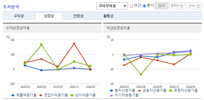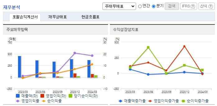 -2024년 3월 전년동기 대비 연결기준 매출액은 14.2% 감소, 영업이익 흑자전환, 당기순이익 흑자전환. 이너뷰티 사업의 핵심 아이템인 콜라겐 매출이 큰 폭으로 감소가 외형 축소의 주요인으로 작용했으나 판관비 통제 등 비용 절감으로 손익은 개선되어 흑자전환함. B2C 사업에 역량을 집중하여 홈쇼핑과 자사몰을 통한 영업을 강화하고, 브랜드력 강화 이후 오프라인, 드럭스토어, 해외 진출 등을 추진할 계획임.