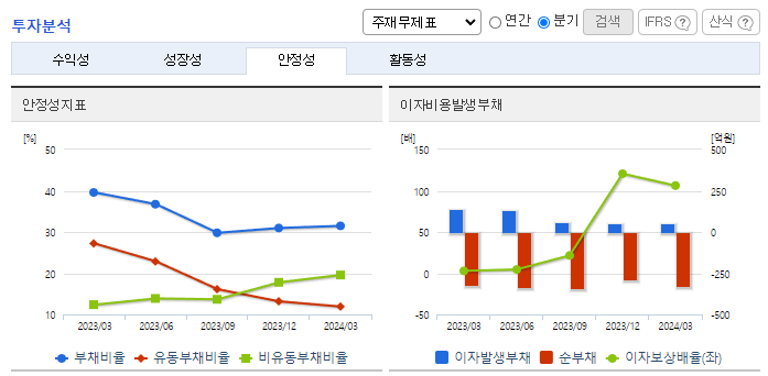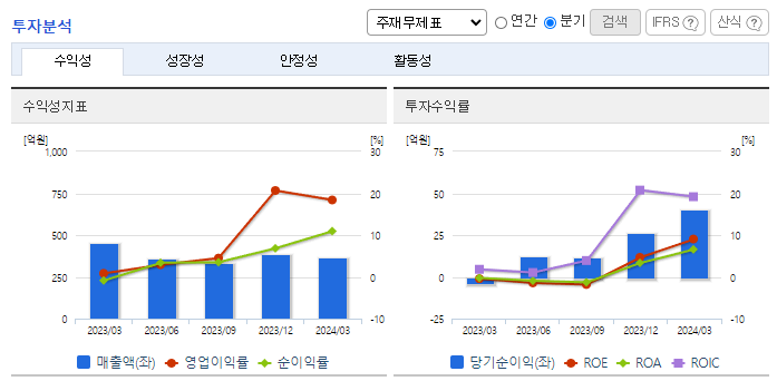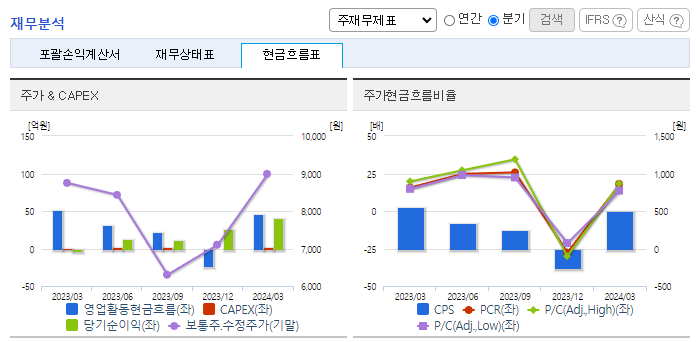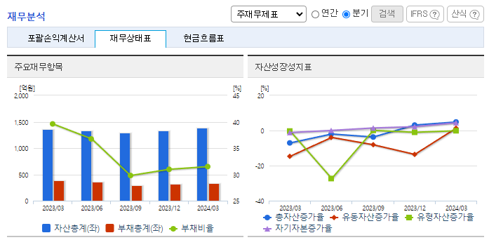 -2024년 3월 전년동기 대비 연결기준 매출액은 14.2% 감소, 영업이익 흑자전환, 당기순이익 흑자전환. 이너뷰티 사업의 핵심 아이템인 콜라겐 매출이 큰 폭으로 감소가 외형 축소의 주요인으로 작용했으나 판관비 통제 등 비용 절감으로 손익은 개선되어 흑자전환함. B2C 사업에 역량을 집중하여 홈쇼핑과 자사몰을 통한 영업을 강화하고, 브랜드력 강화 이후 오프라인, 드럭스토어, 해외 진출 등을 추진할 계획임.