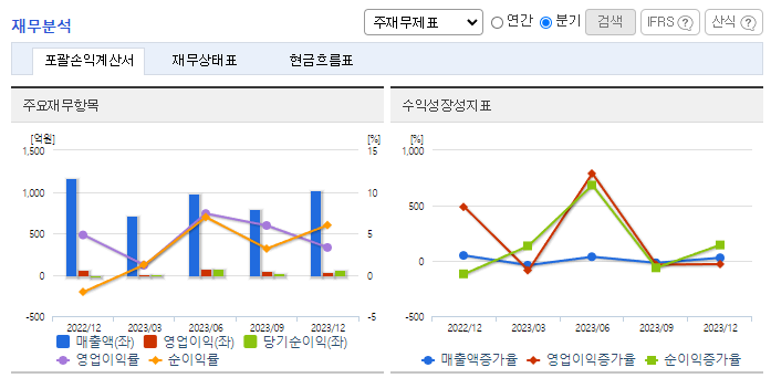 -2023년 12월 전년동기 대비 연결기준 매출액은 0.6% 감소, 영업이익은 13.9% 증가, 당기순이익은 24.6% 감소. 국내 반도체 업체의 시설 투자 규모 축소로 인해 동사의 국내 반도체 매출은 감소하였지만, 중국향 수출 매출액이 꾸준히 증가하여 매출 견인함. 원가 개선과 비용 절감을 통해 영업이익 증대하였으나, 비경상적 영업 외 수익 감소로 당기순이익 감소함.