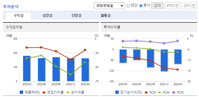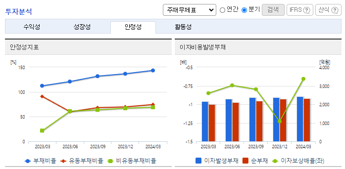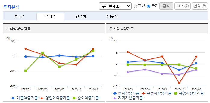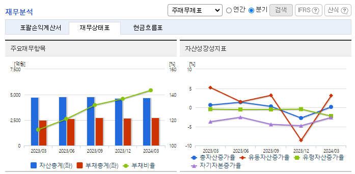 -2024년 3월 전년동기 대비 연결기준 매출액은 10.2% 감소, 영업손실은 13% 증가, 당기순손실은 7.6% 증가. 유형자산처분이익 768,334(천 원) 및 잡이익 36,097(천 원)이 발생함에 따라 기타 수익이 증가하였음. 장기차입금의 증가로 인해 이자비용이 전분기 대비 42.2% 증가하였으며 잡손실이 27.4% 증가하며 당기순이익이 감소하였음. 부채비율 감소를 위해 대구백화점 본점 부동산 매각을 진행하고 있음.